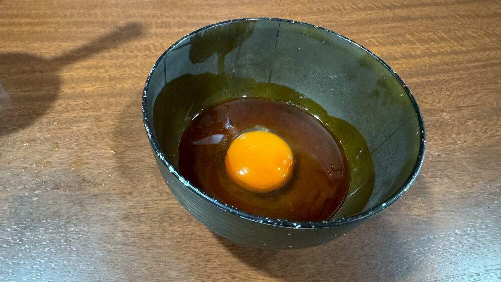 ▲有料トッピングのラー油の生たまごも早々に提供。けっこうガッツリとラー油が入っていますね。