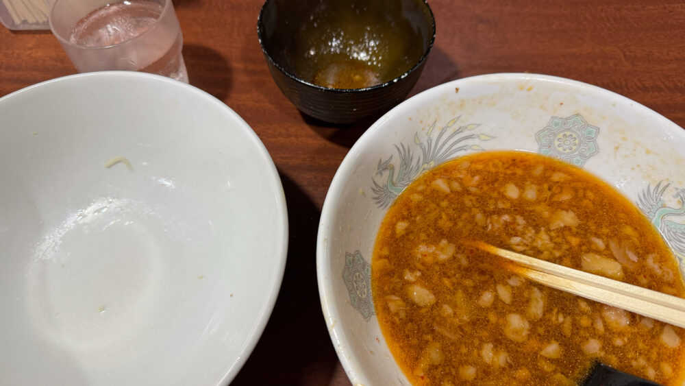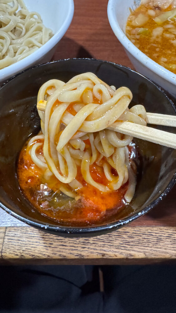 ▲つけ汁は非乳化系。ラー油っぽい赤さですが、シークワーサーの酸味が強くてめちゃ旨。