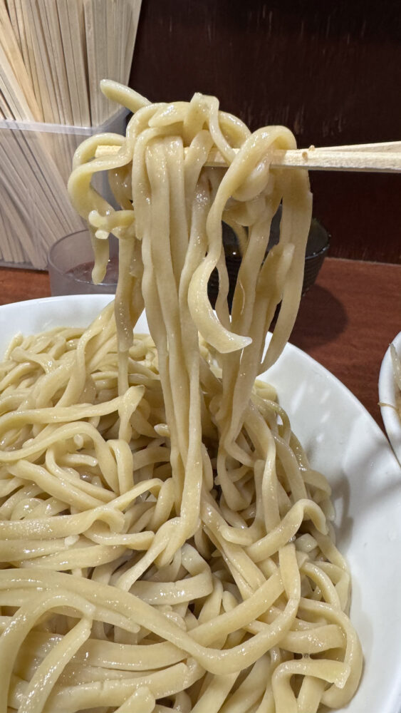 ▲平打ちっぽい中太麺。水で締められているのでツルワシ食感。