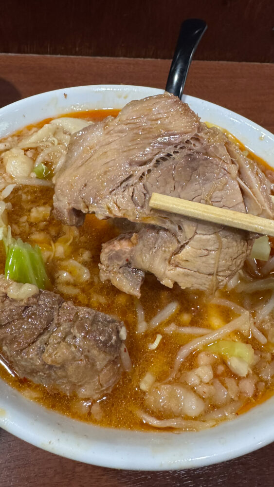 ▲つけ汁の中に野菜が入っているのに、横から見てもかなりの標高。豚が沈んで地盤が上がっているのだと思います。