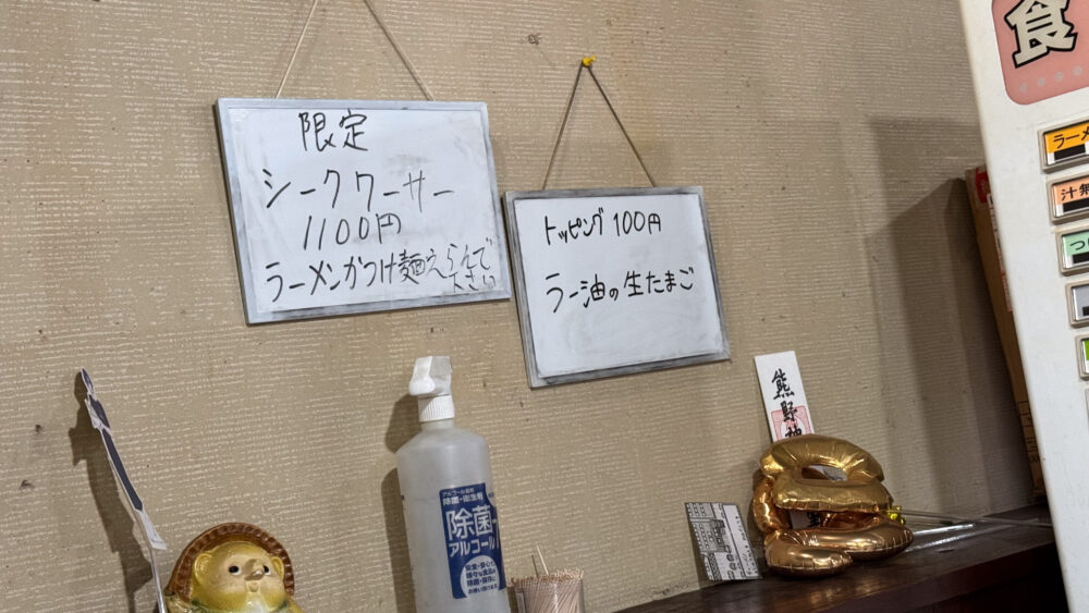 シークワーサーは1,100円の「限定」、ラー油の生たまごは「トッピング100円」の食券をそれぞれ購入でした。