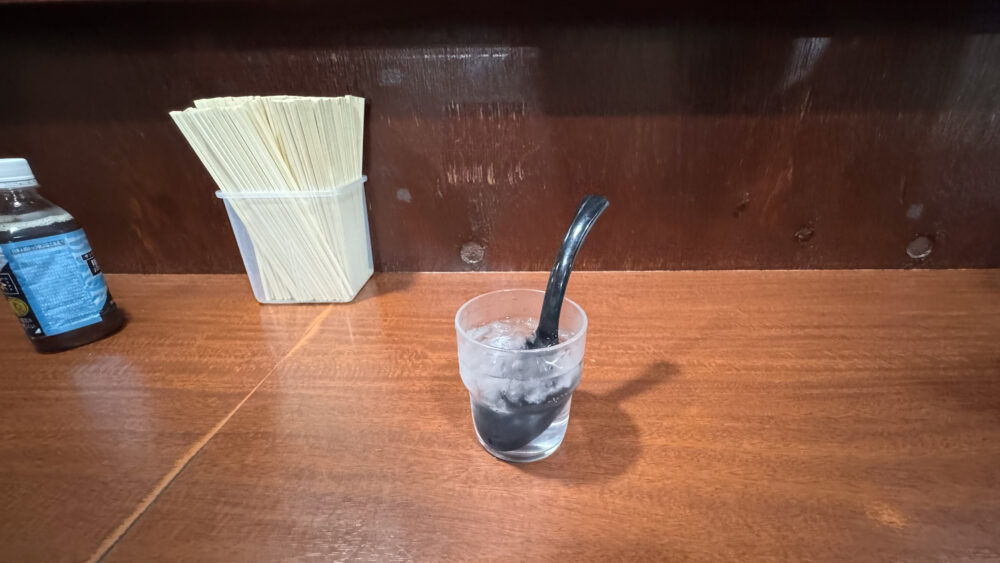 ▲卓上には割りばしのみ。調味料は共用になり、給水機付近にあります。
