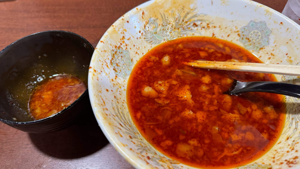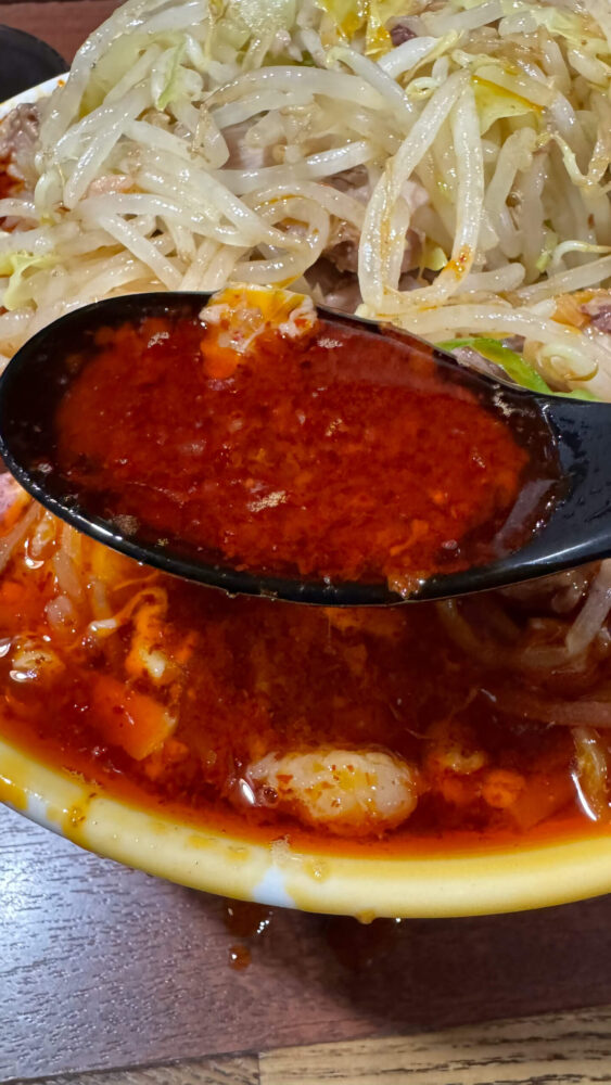 ▲スープは唐辛子やラー油が効いて本格的な辛旨!辛党じゃないときついかもです。