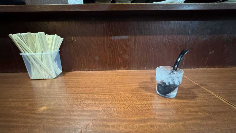 ▲卓上には割りばしのみ。調味料は共用になり、給水機付近にあります。