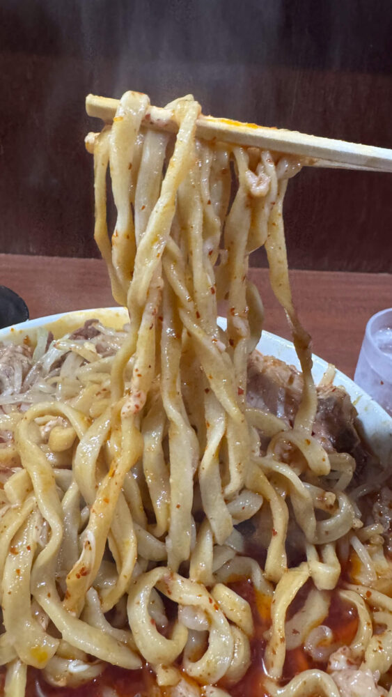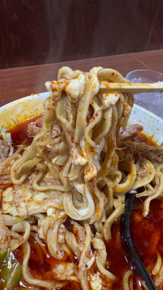 ▲平打ちっぽい中太麺。唐辛子がしっかり絡んで辛旨テイスト。