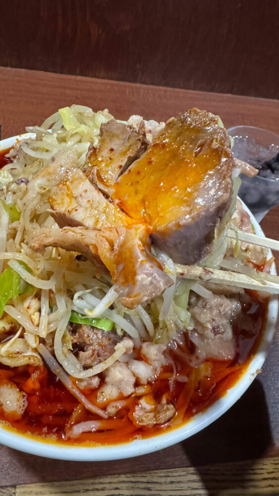 「辛麺豚増し(ヤサイアブラマシマシカラメ)+チーズ+生卵」を実食!
