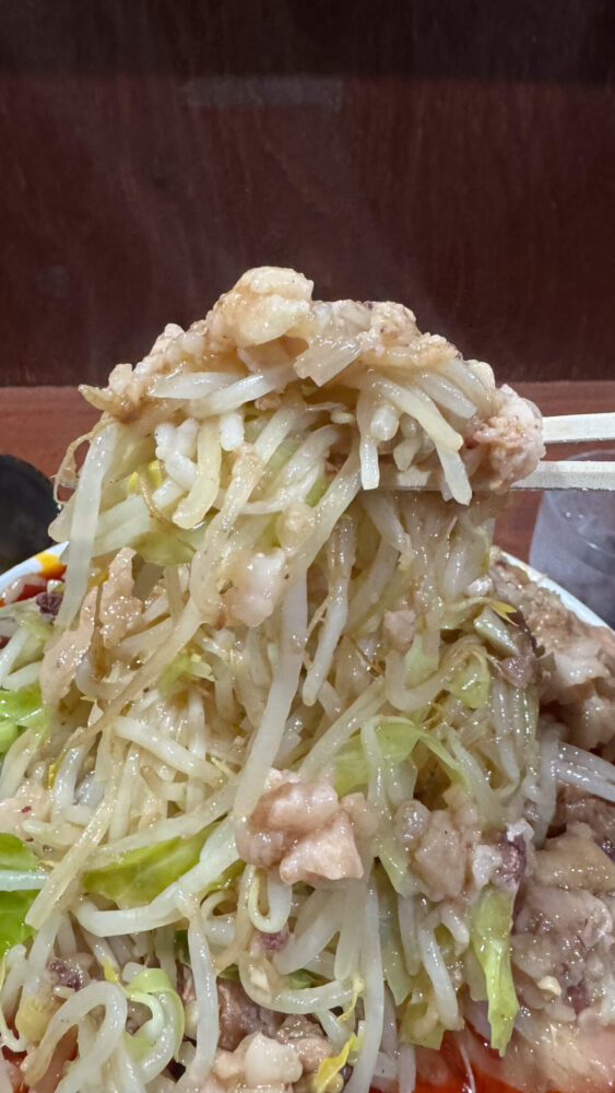 ▲横から見ると、野菜タワーの標高の高さが分かります。背脂もマシマシにしたので圧巻の量。