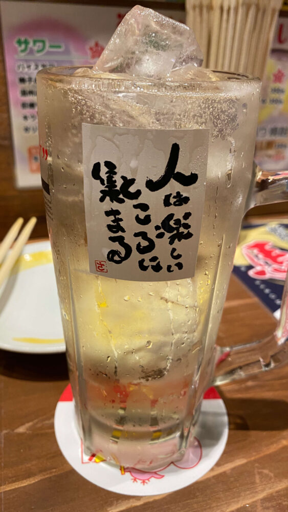 ▲ハイボール(税込165円)。こちらも安い!ジョッキの言葉は「人は楽しいところに集まる」。