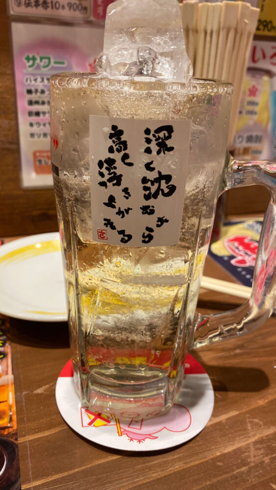 ▲ハイボールのお替り。ジョッキの言葉は「深く沈むから高く浮き上がれる」。