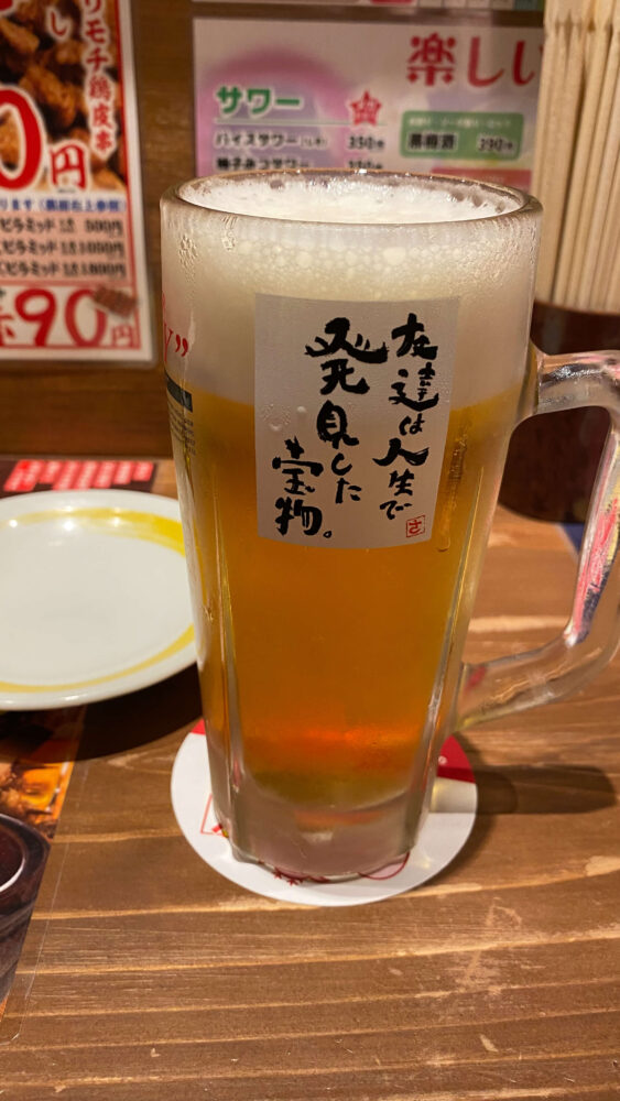 ▲生ビール(税込209円)が安い!ジョッキの言葉「友達は人生で発見した宝物。」も染みます。