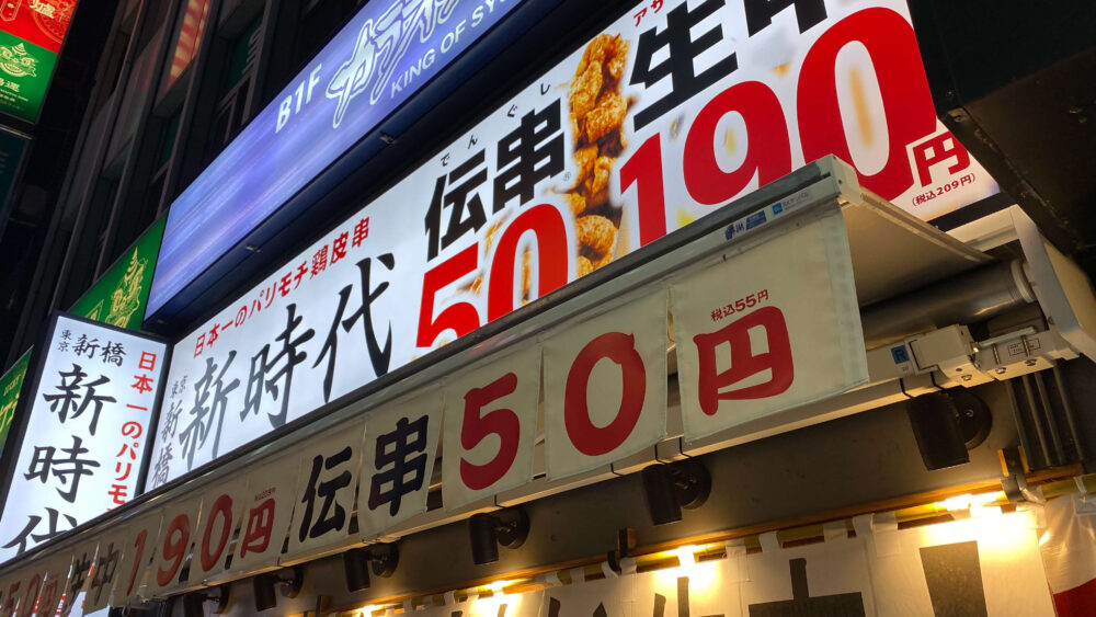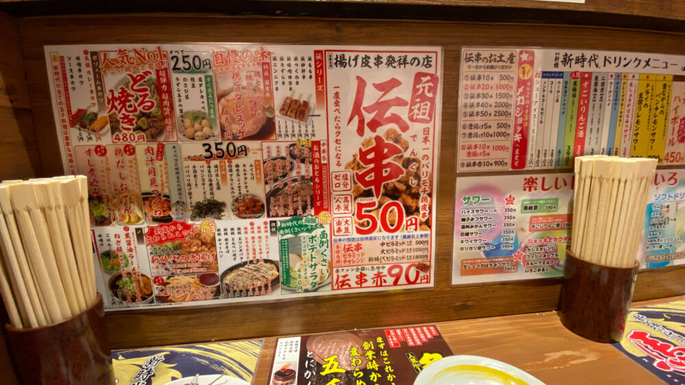 ▲「伝串50円 生中190円」という破格の価格帯が看板で強調されておりインパクト大。