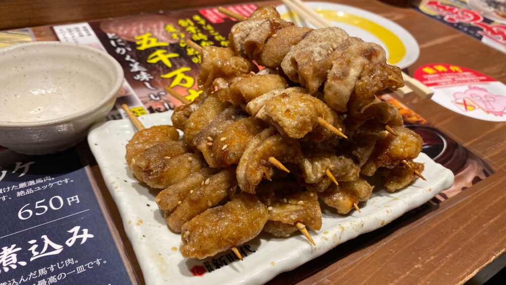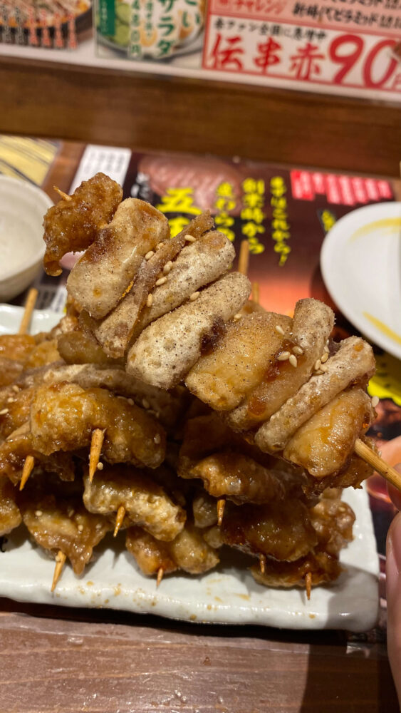 ▲「日本一のパリモチ鶏皮串」の謳い文句に偽りなし!パリモチ食感でスパイシーな味付けで美味。