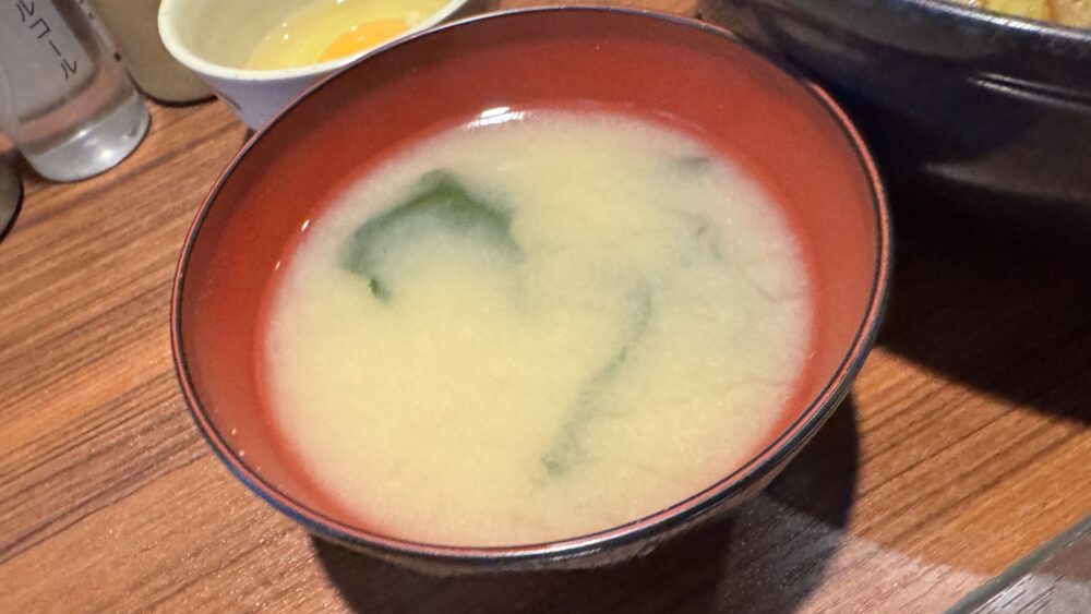 ▲まずははやる気持ちを抑えて味噌汁から。ホッとする味わい。