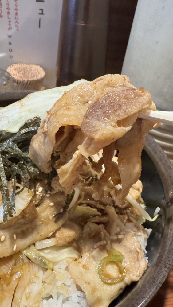 ▲豚肉は柔らかく、甘めの生姜焼き的な味付けで旨い。キャベツやネギなどの野菜の食感も良いアクセント。