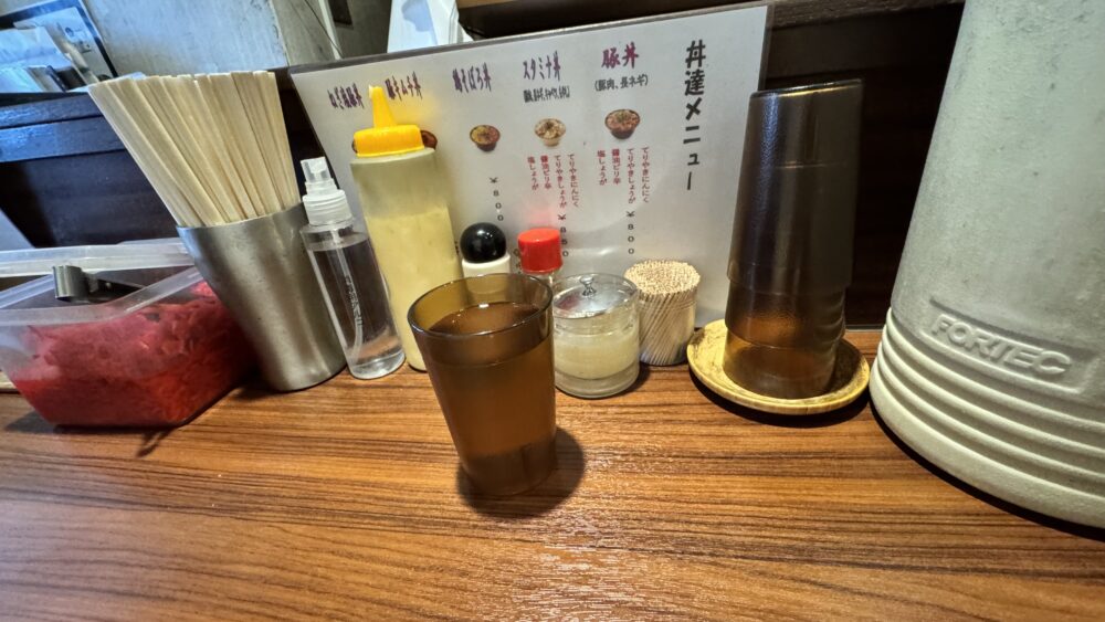 ▲卓上調味料は七味唐辛子、おろしにんにく、マヨネーズ、紅ショウガなど。