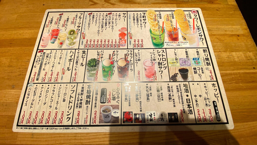 ▲上がフード、下がドリンクのメニュー。いずれも格安ですが、赤字は税抜表示なのでご注意を。