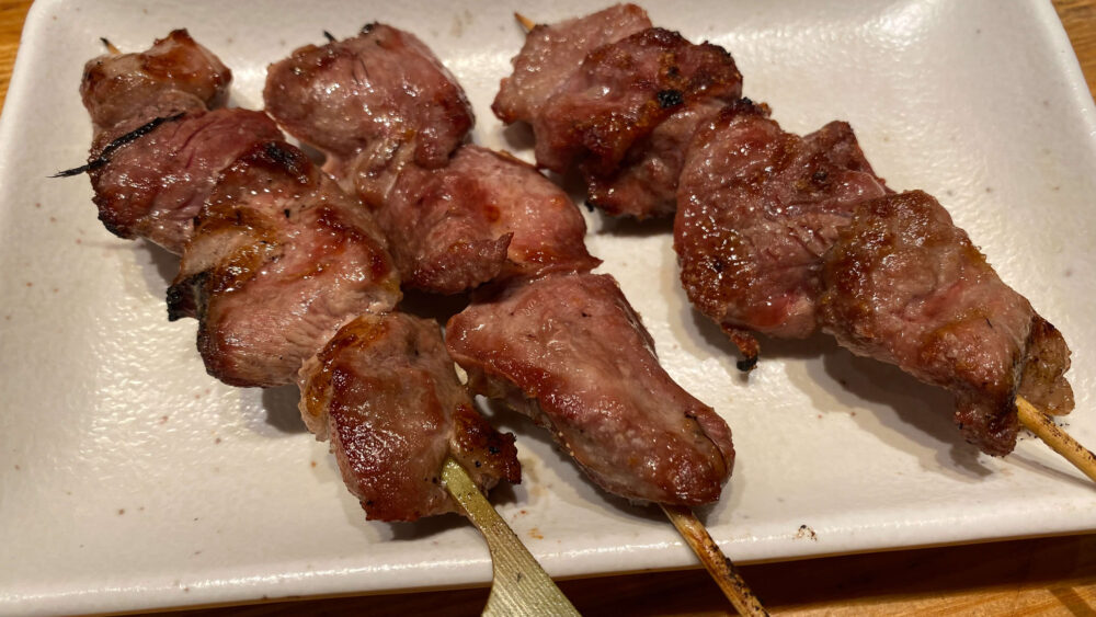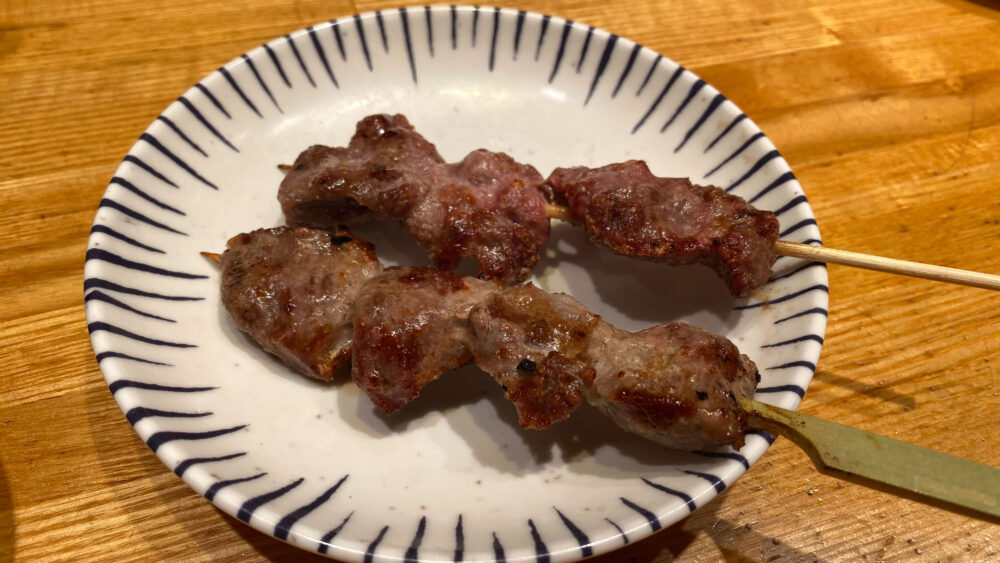 ▲串焼きのお替り。鶏のすなぎも(税込99円)と豚のはらみ(税込110円)。こちらも旨い。