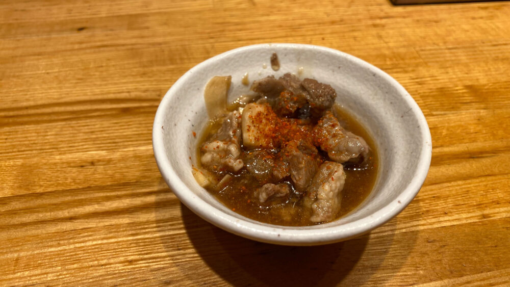 ▲豚モツスタミナ漬け(税込319円)。小さいけどパンチがあってお酒が進みます。