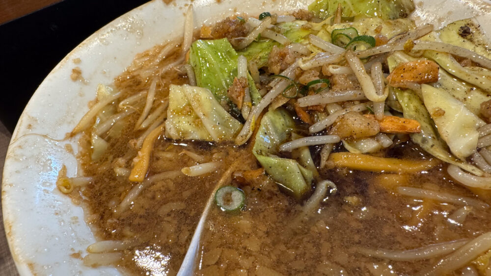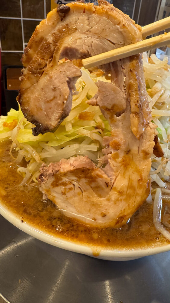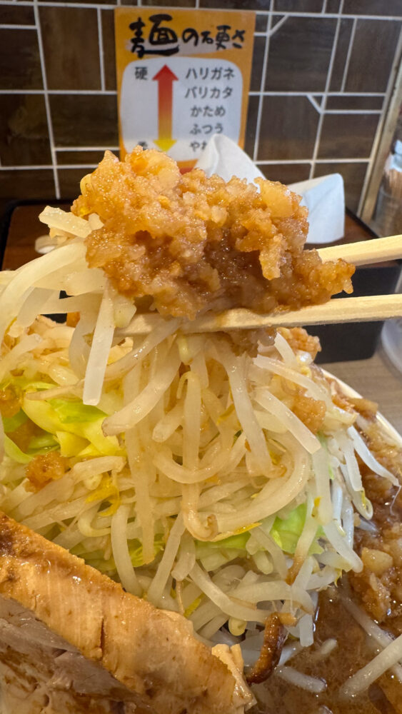 ▲横から見ると、野菜タワーの標高がすごい。山頂の背脂もけっこうな量で嬉しい。