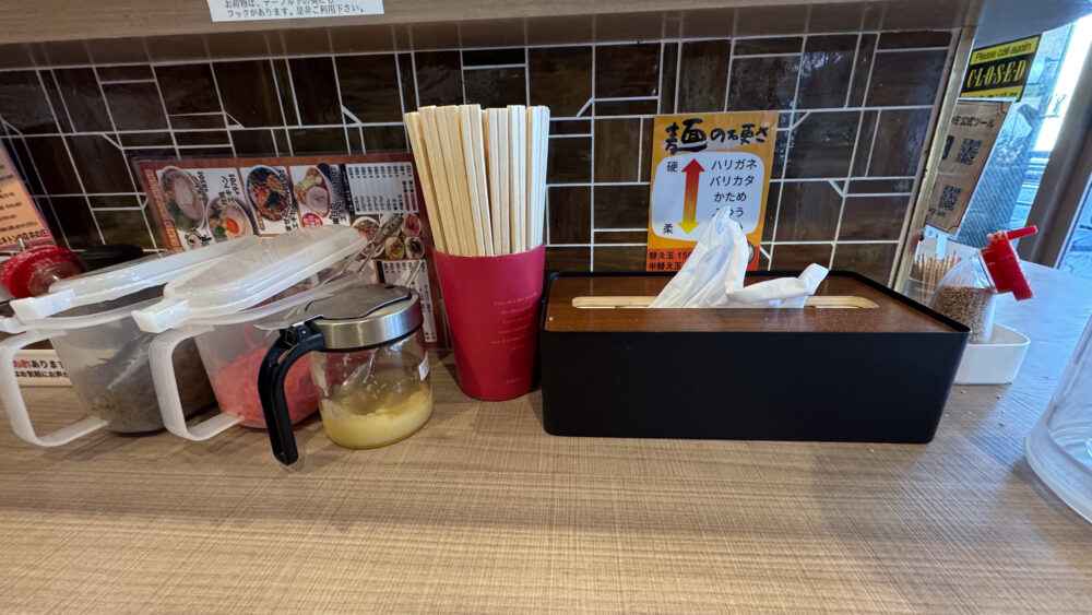 ▲卓上調味料はおろしニンニク、紅生姜、高菜、すりごま、胡椒、タレ。豚骨らーめん屋さんならではのラインナップ。