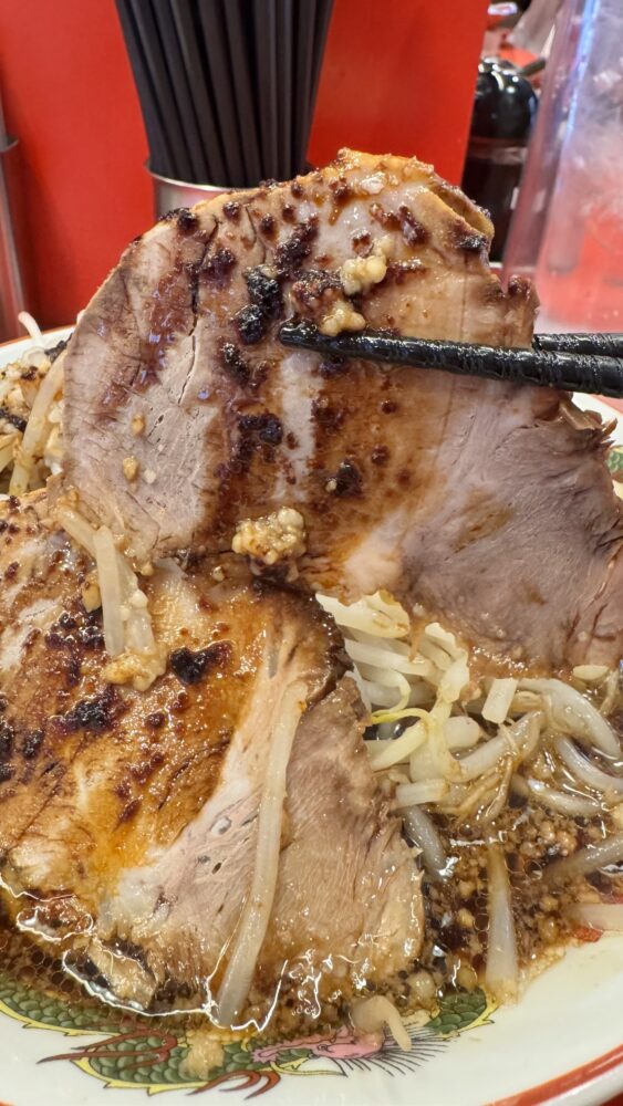 ▲チャーシューは大判でむっちり食感。マー油のパンチがプラスされて旨い。