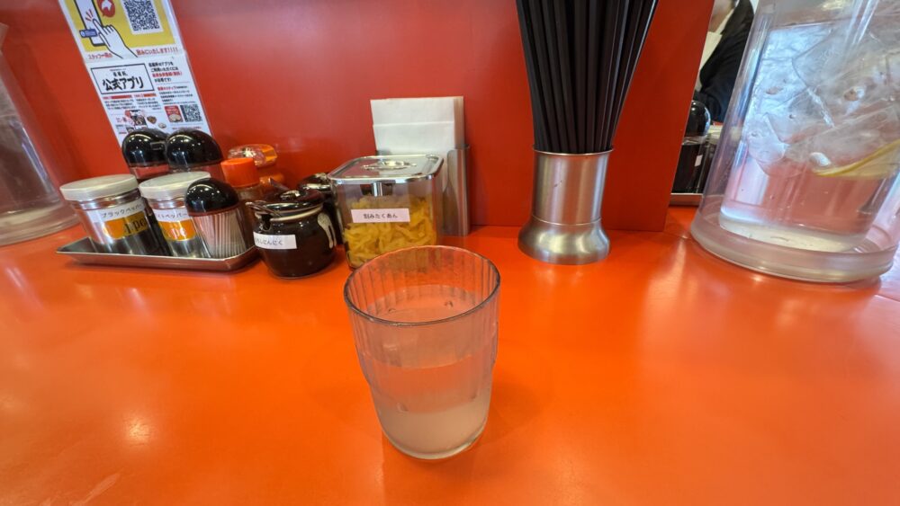 ▲卓上調味料は、しょうゆ・お酢・ラー油・胡椒・たくあんなど豊富なラインナップ。