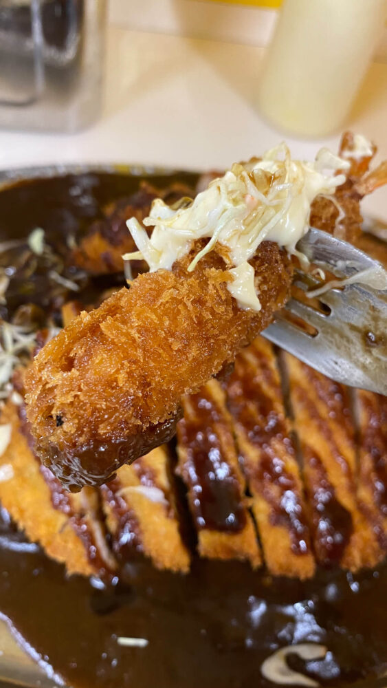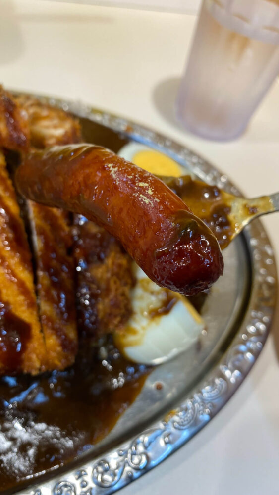 黒っぽいルーの上に、カツ×2にウィンナー、エビフライ、玉子などの具沢山で豪華なカレー!