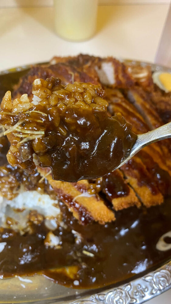 ▲ドロッと粘度が高く、黒っぽいルー。濃厚なので普通のカレーよりもさらにご飯が進む味わい。