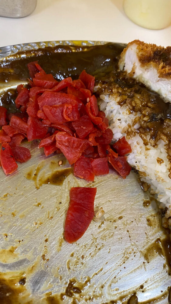 ▲後半は卓上の福神漬けを投入。真っ赤で福神漬けは間違いない。これでラストスパート!