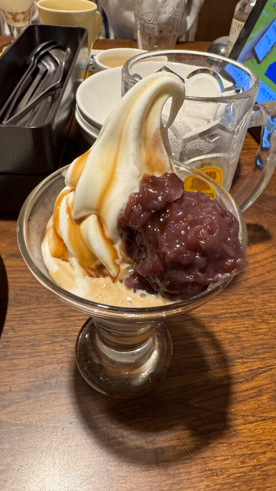 ▲〆のデザートはあんこサンデー。あんこの甘さがソフトクリームを引き立てて美味ですね!