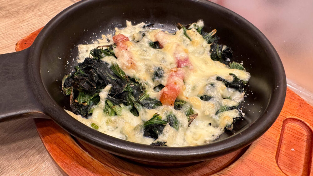 ▲ほうれん草とベーコンのチーズ焼きも到着。チーズとほうれん草がカリッカリで美味しそう。