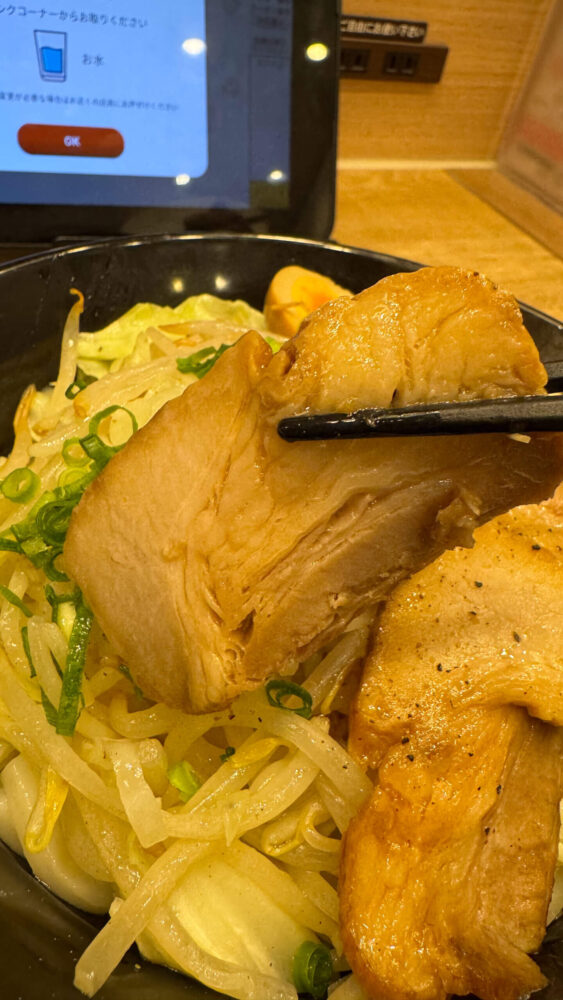 ▲野菜はもやしとキャベツに加え、刻みネギもあります。つけ汁にディップして食べると美味しい。