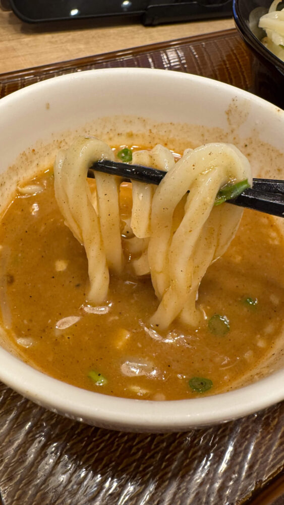 ▲つけ汁にうどんを投入。魚介の効いたつけ汁が麺に絡んで旨し。