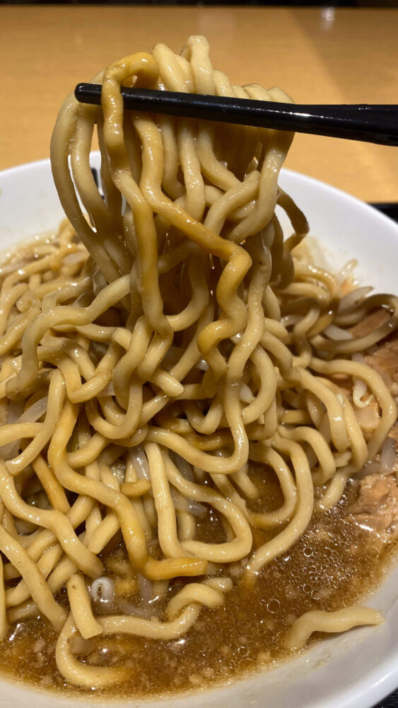 ▲麺は二郎系では細め。油をまとってすすり心地は良き。