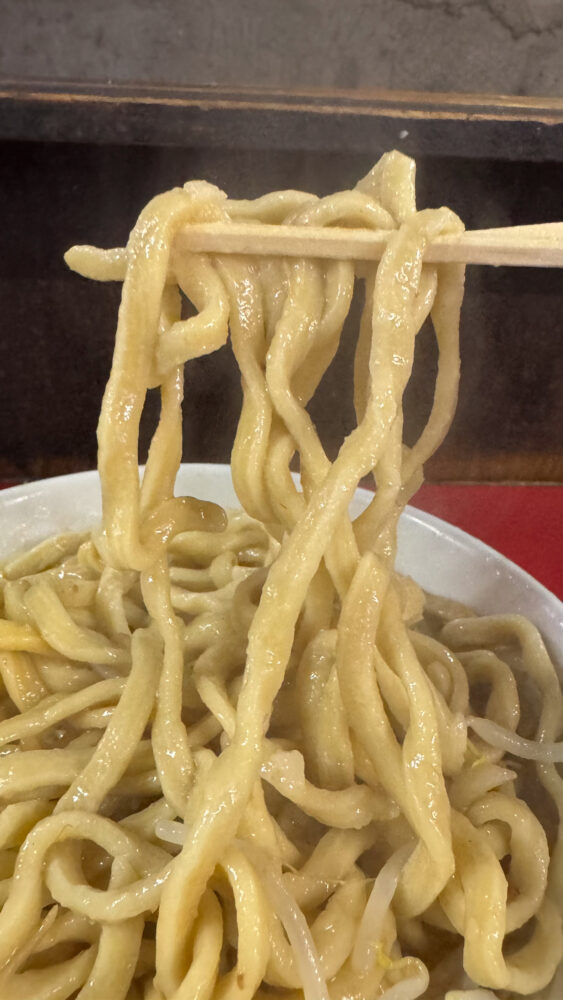 ▲麺は、極太のバキボキ食感で旨い。武蔵野うどんのような強い弾力で、小麦の旨味が楽しめ食べ応え抜群。