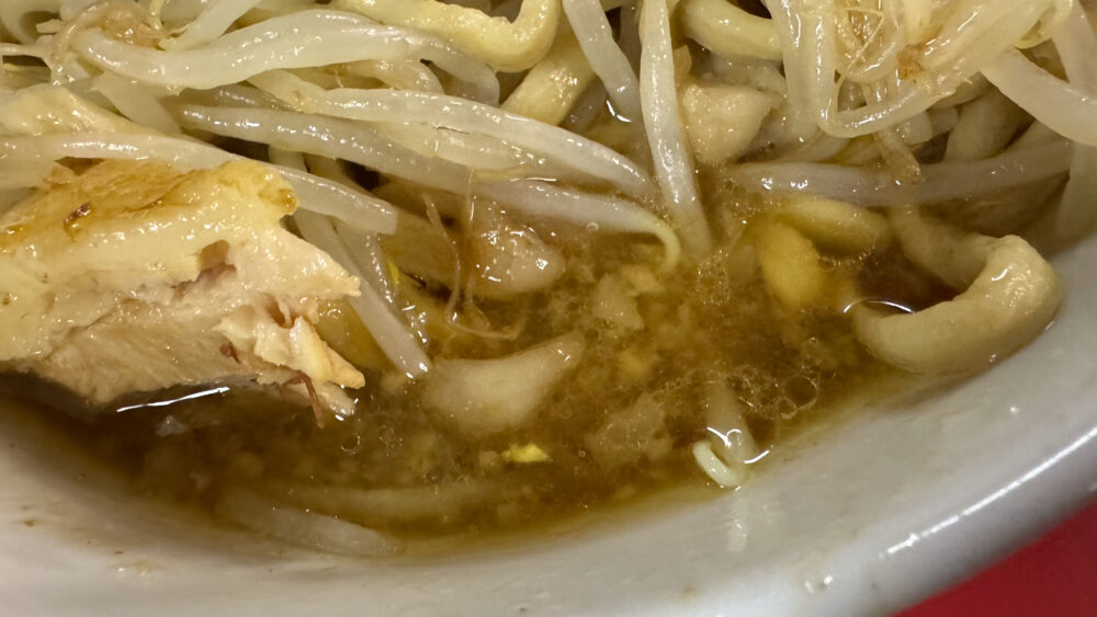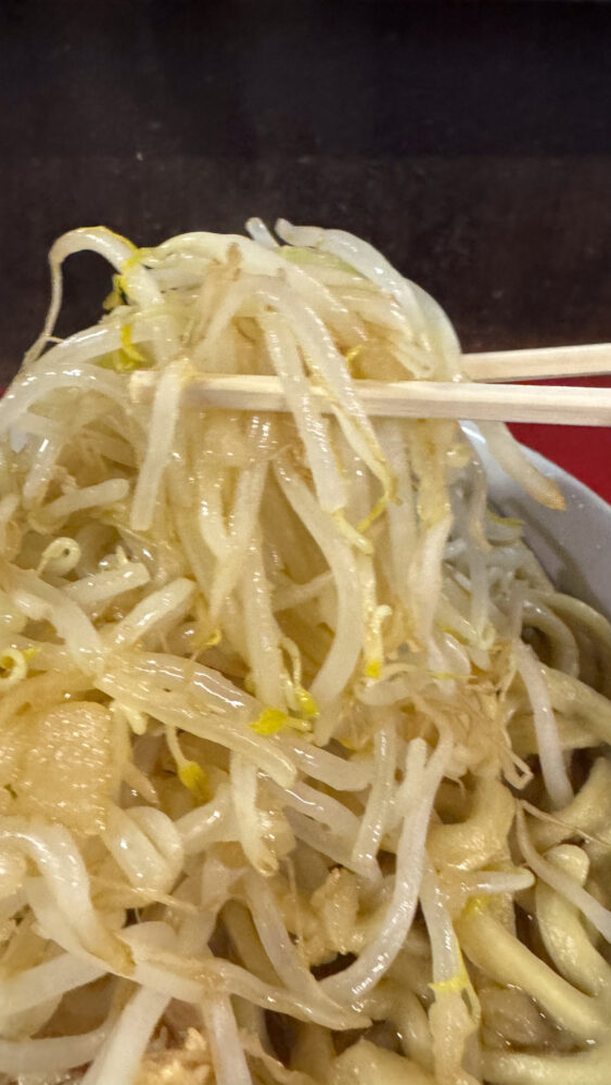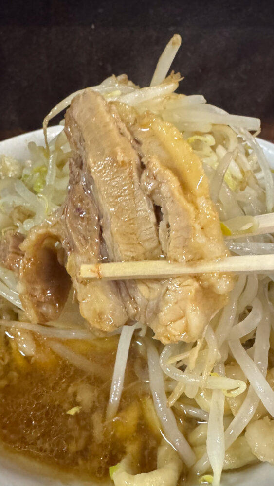 ▲横から見ると、きれいなヤサイタワー。背脂もほんのり色付いています。