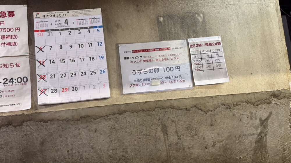 ▲店内に無料トッピングや注意事項の張り紙があります。