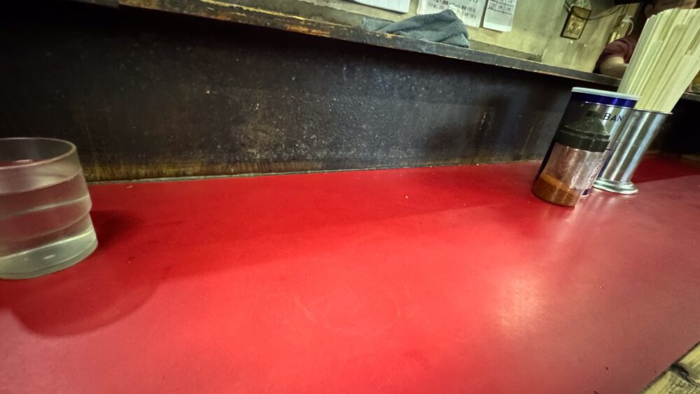 ▲卓上調味料は、一味唐辛子とブラックペッパーというシンプルな構成。