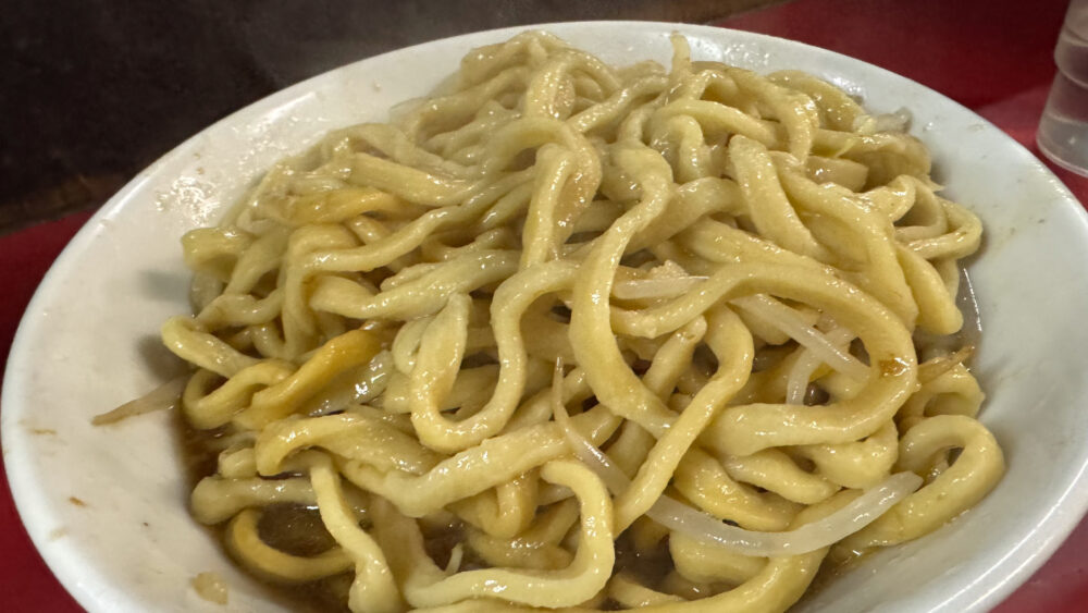 極太麺は茹で後の麺量がそこまで増えた感じがしないので、食べ応えがあるのに案外重量を感じなくて不思議ですね。
