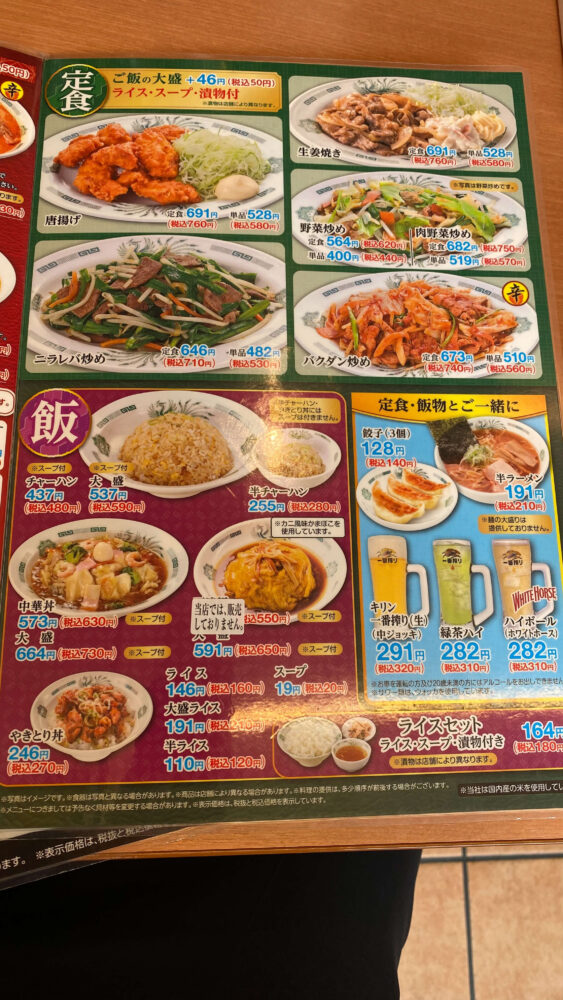 ▲上が定食メニュー、下がおつまみ+ドリンクのメニューです。他にラーメンのメニューもあります。
