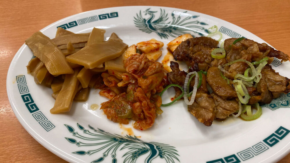 ▲三品盛合わせ(税込340円)。メンマ・キムチ・やきとりを一皿で楽しめます。チビチビお酒飲むのにうってつけ。