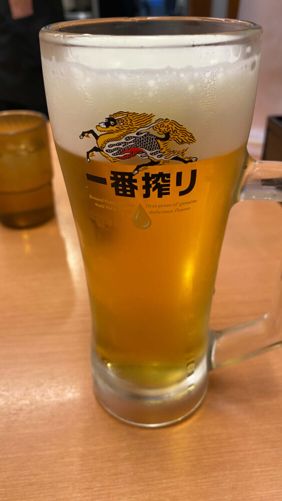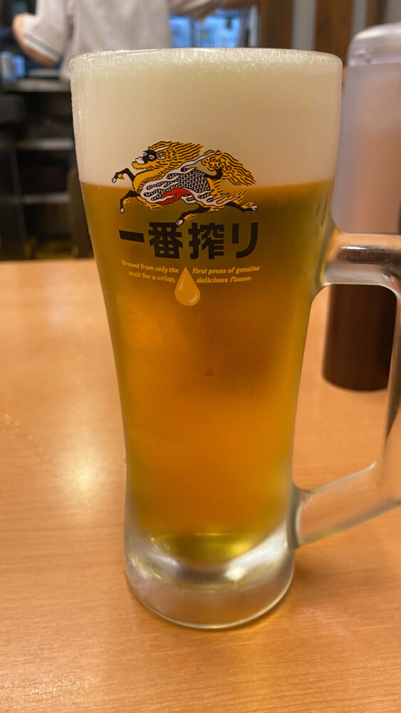 ▲生ビール(税込320円)。麒麟一番搾りの中ジョッキですね。最高に美味。