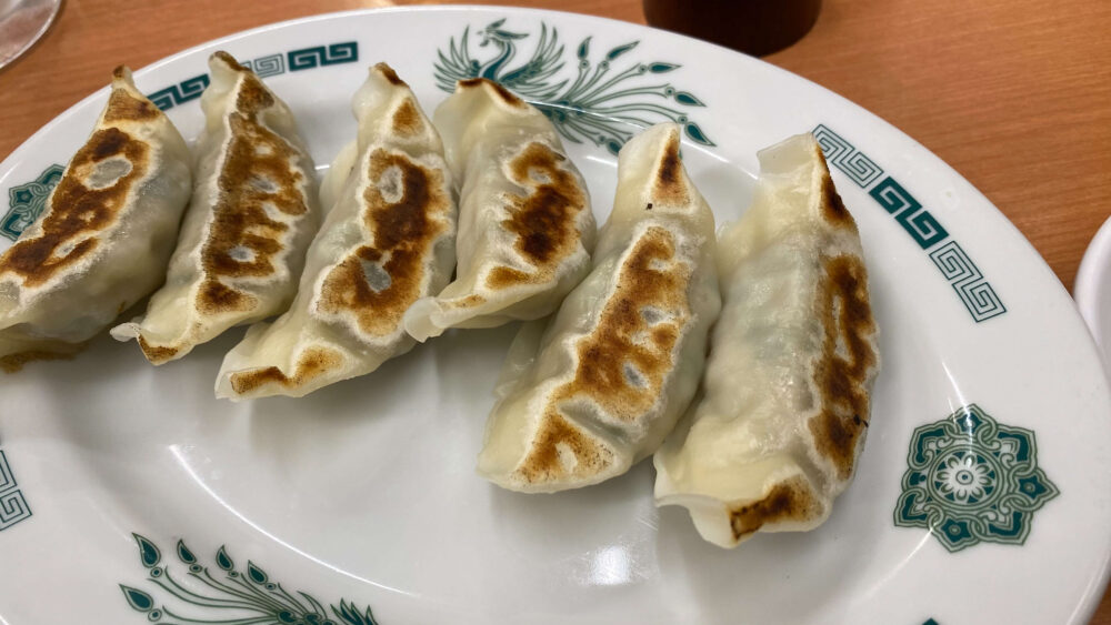 ▲餃子6個(税込250円)。安くてちょうど良いサイズで美味しい!酢胡椒で食べました。