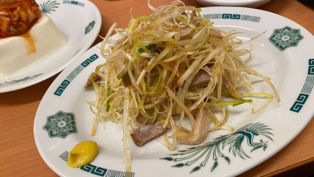 ▲おつまみネギチャーシュー(税込330円)。白髪ネギがたっぷり。からしが添えられているのも高ポイント。