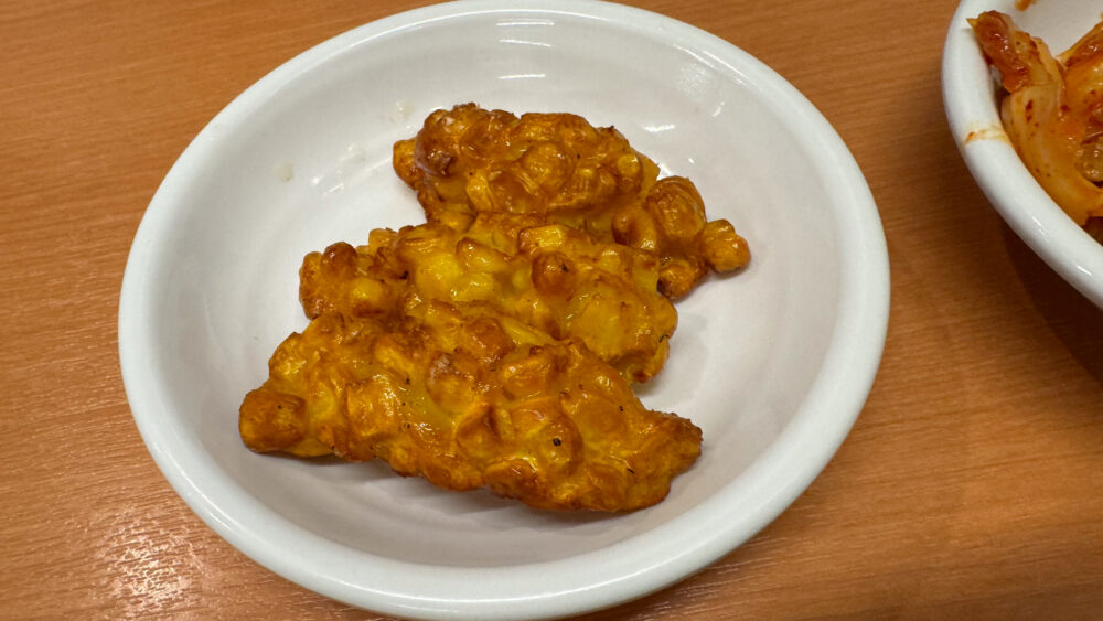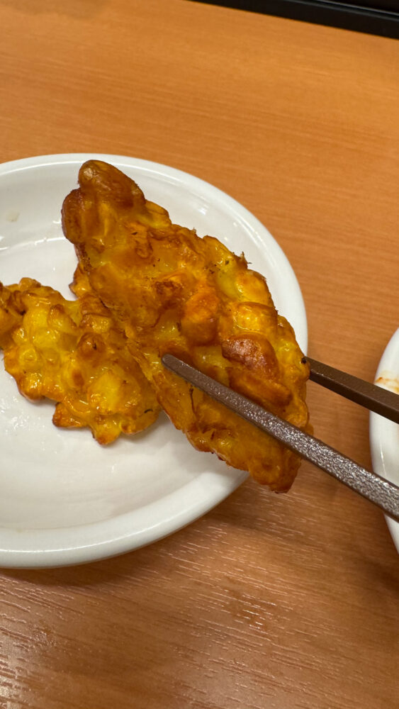 ▲続いてとうもろこしの香り揚げ。1皿3個入り。