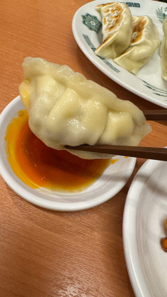 ▲お酢とラー油を多めにしたタレにつけて食べる餃子は美味しい。お酒も進みます。