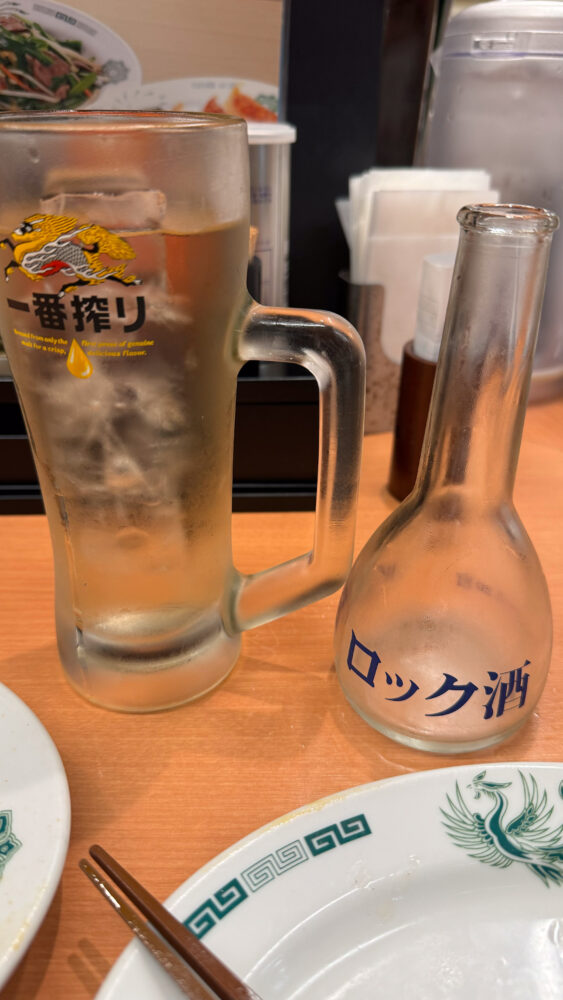 キリン一番搾り生ビール+バクダン炒め+餃子(6個)+吟醸ロック酒+中華チャーシューメン(2024年7月中旬)