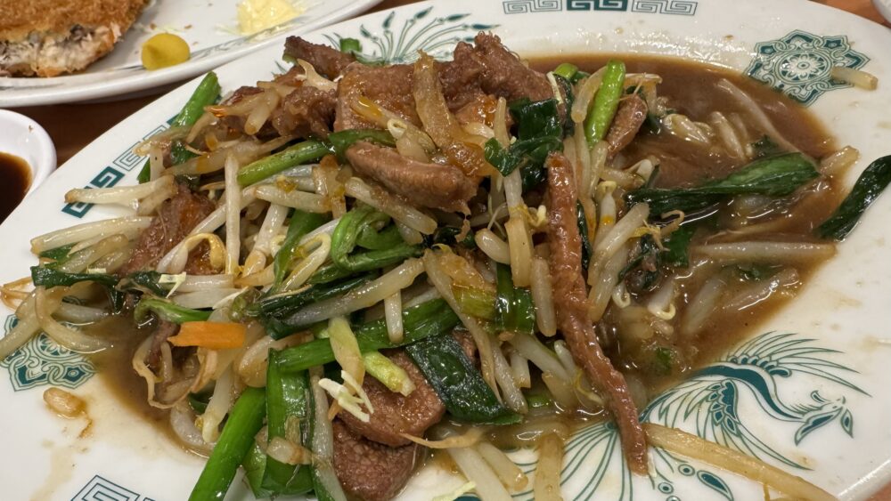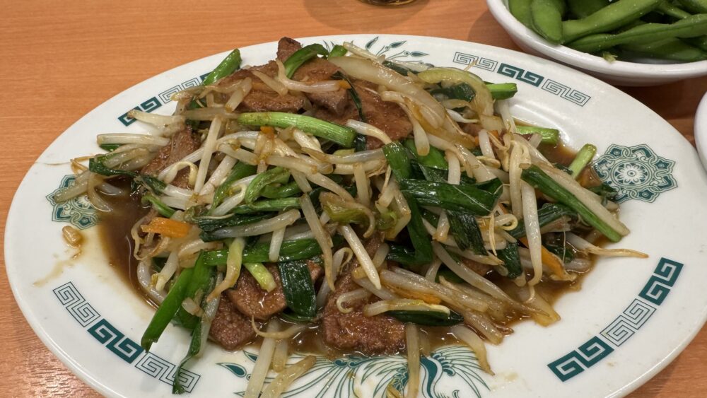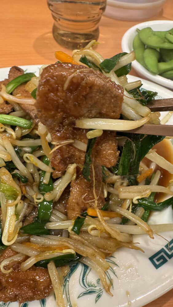 ▲メインのニラレバ炒めが着皿。居酒屋よりも一皿のボリュームがあって嬉しい。