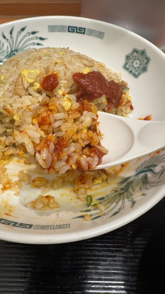 ▲チャーハンを秘伝の辛味噌で味変。一気に辛旨になって最高。