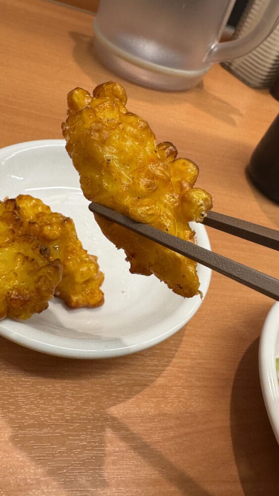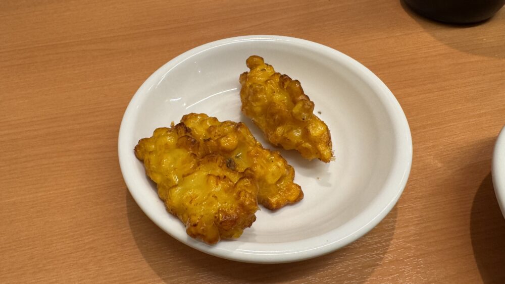 ▲続いて、とうもろこしの香り揚げ。3個で一皿。